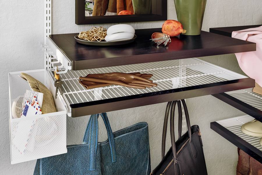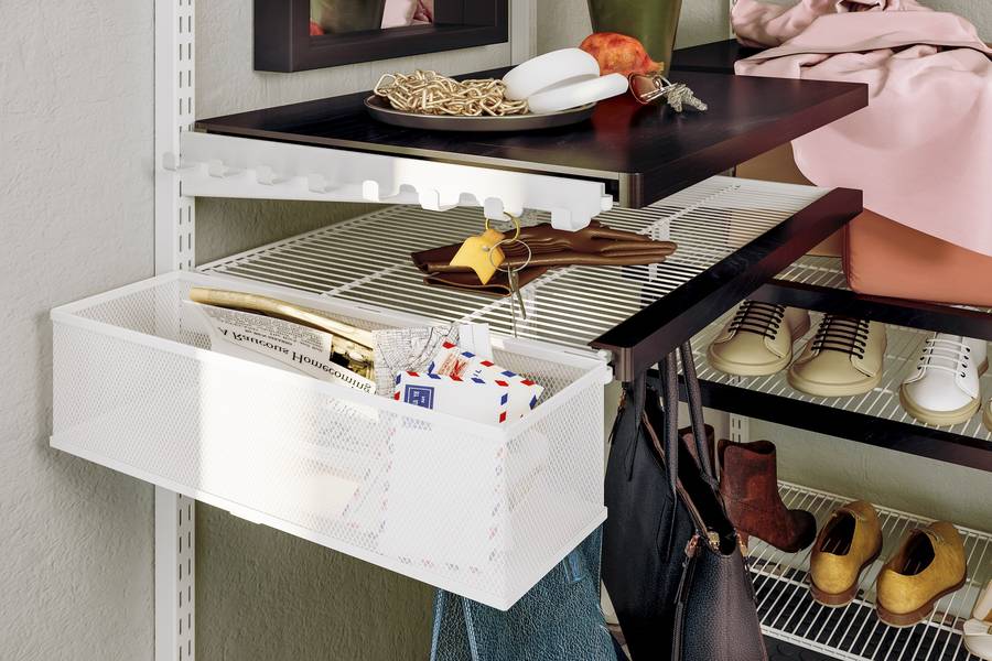 Модульность системы позволяет продумать хранение до мелочей с учётом предпочтений хозяев. Например, используя проволочные полки разной длины, выделить место под обувь с высоким голенищем: ботильонов и сапог.